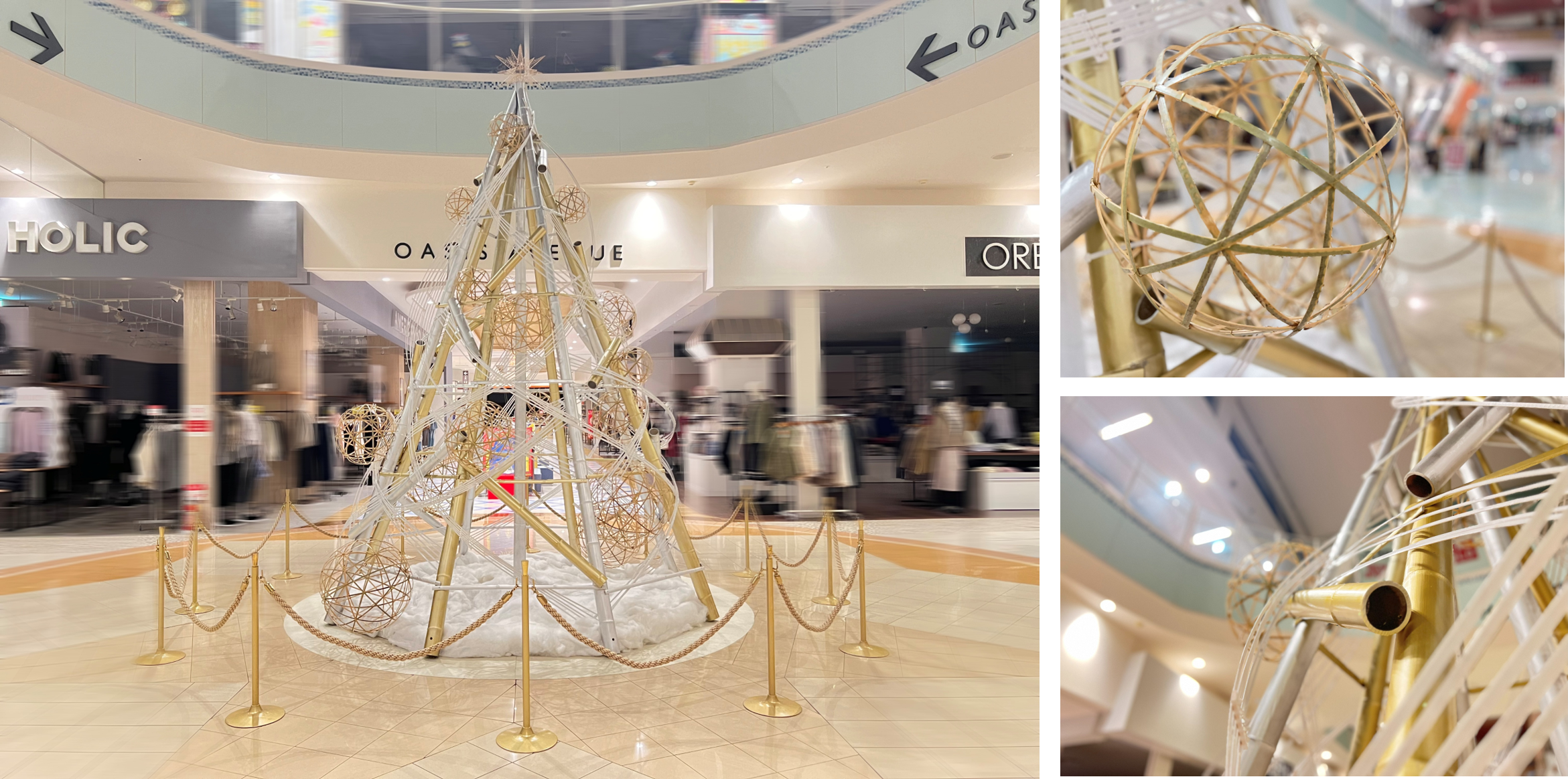 竹ツリーに使用される竹は一本一本が地元の自然から生まれた命ある素材。その美しさを活かすため、自然な質感を残しながらクリスマスらしいきらめきと調和するように設計・装飾を行いました。竹の直線と竹筋のアーチを生かし、オーナメントには竹ツリーのために制作した竹ボールを飾り、温かみと静けさを感じる存在感のあるツリーがお客様を迎えます。さらに、素材の背景や再利用の意義を伝える説明パネルも併設し、来館されるお客様に考えるきっかけとなる仕掛けを盛り込んでいます。