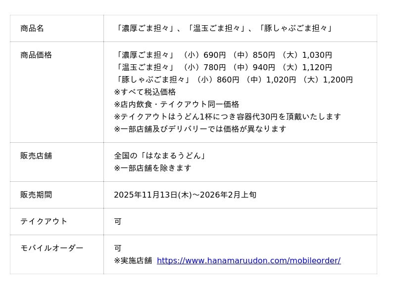 讃岐うどんチェーン「はなまるうどん」を展開する株式会社はなまる(本社:香川県高松市 代表取締役社長:前田良博、以下はなまる)は、2025年11月13日(木)より、全国のはなまるうどん(※一部店舗除く)にて、「濃厚ごま担々」「温玉ごま担々」「豚しゃぶごま担々」を期間限定で販売いたします。