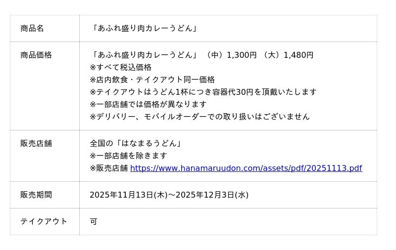 また同日より、高松兵庫町店(おいでまい!さぬきプロジェクト店舗)で人気を博している「あふれ盛り肉カレーうどん」を各店1日15食限定で、全国の店舗(※一部店舗除く)にて、期間限定で販売いたします。
