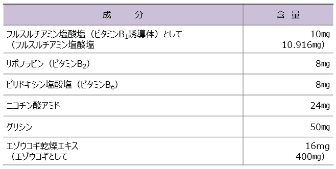 - 三大栄養素(糖質、脂質、タンパク質)を効率よくエネルギーに変える働きを助けるフルスルチアミン、ビタミンB2、ビタミンB6、ニコチン酸アミドを配合しています。