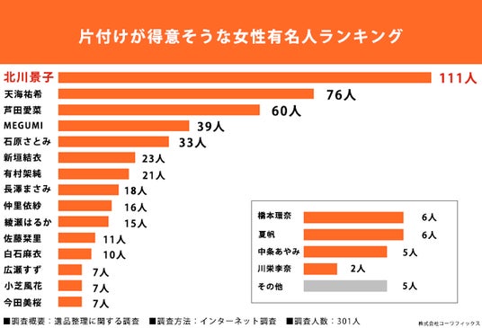 「片付けが得意そうな女性有名人を教えてください。(複数回答可)」と質問したところ、第1位「北川景子さん」(111人)、第2位「天海祐希さん」(76人)、第3位「芦田愛菜さん」(60人)という結果になりました。