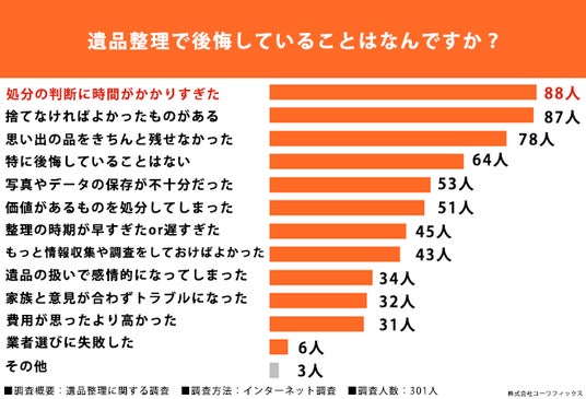 ・遺品整理で後悔していること「処分の判断に時間がかかりすぎた」が最多(88人)、僅差で「捨てなければよかったものがある」(87人)