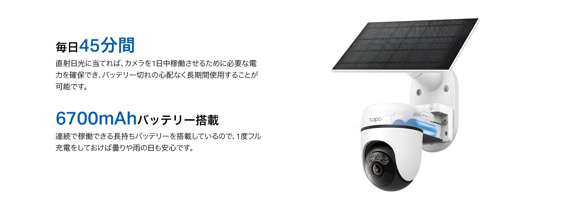*2: 45分間の太陽光給電は標準的な環境条件(1000W/平方メートル ・25℃・AM1.5)および1日あたり最大100件のイベントをトリガーした場合のテスト結果に基づいています。実際の給電性能は、設置角度・気象条件・カメラの使用状況によって異なる場合があります。