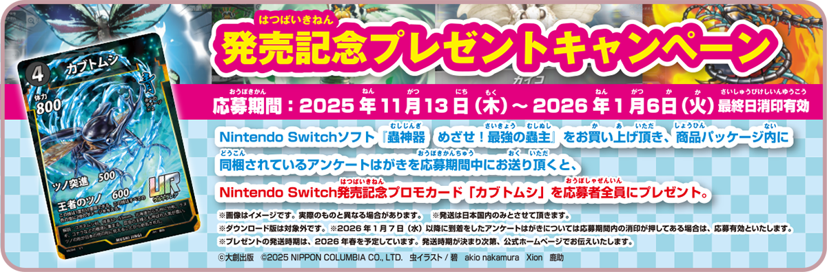 Nintendo Switchソフト『蟲神器 めざせ!最強の蟲主』の発売を記念して、期間限定の応募者全員プレゼントキャンペーンを実施させていただきます。