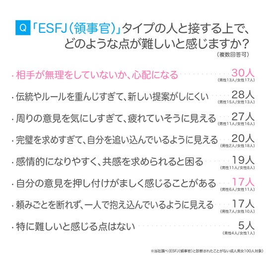 一方で、ESFJ(領事官)と接する上で難しいと感じるところもあるようです。