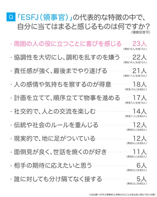 より詳しくESFJ(領事官)について調査するために、先ほどのアンケートとは別に、「ESFJ(領事官)と診断された経験のある成人男女100人」を対象にアンケートを実施しました。