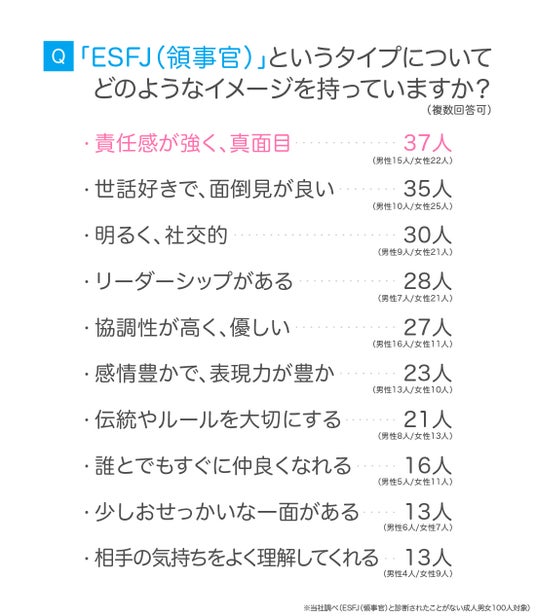 続いては、「ESFJ(領事官)と診断されたことがない成人男女100人」を対象に、ESFJ(領事官)に対するイメージを尋ねました。