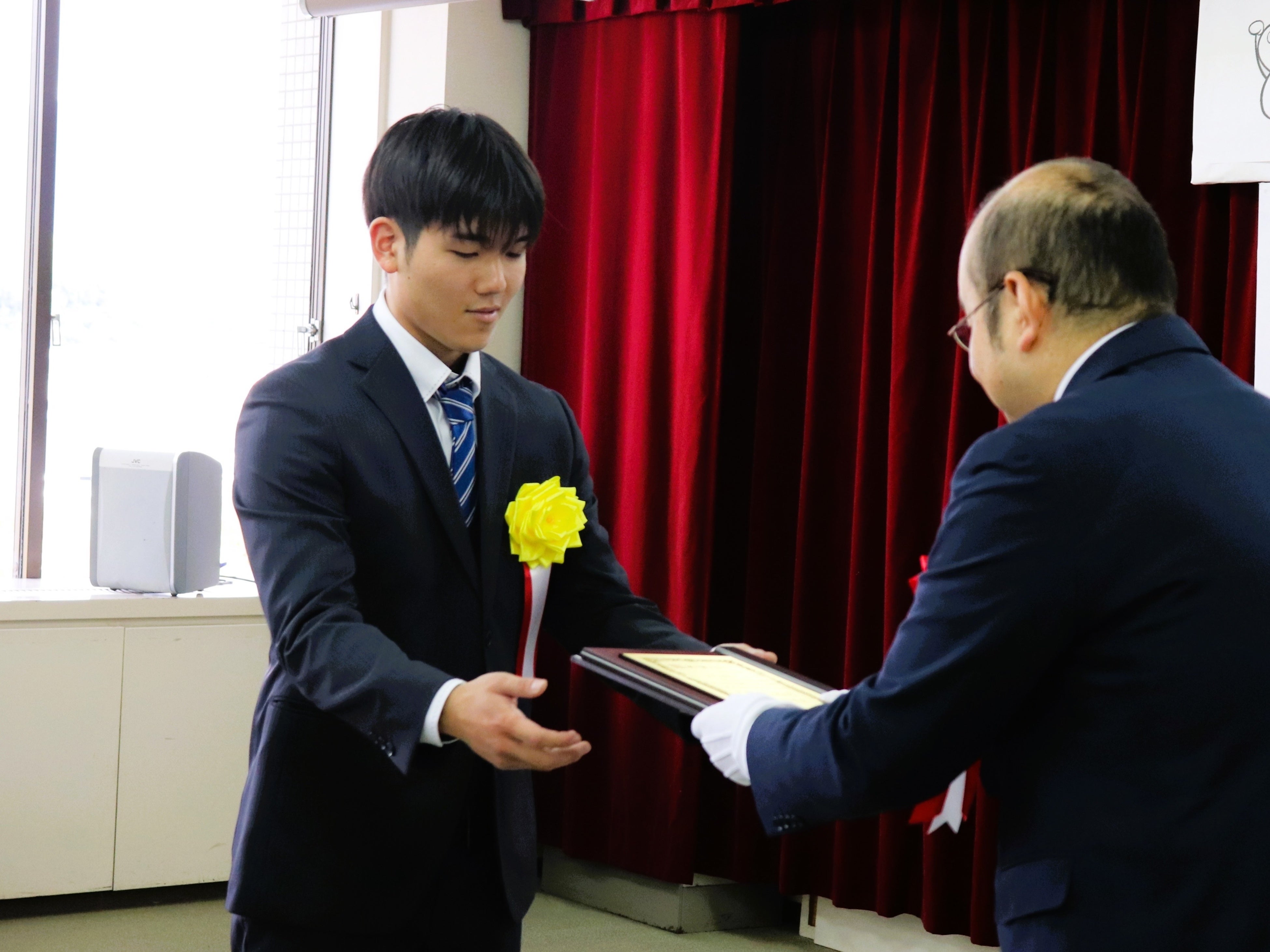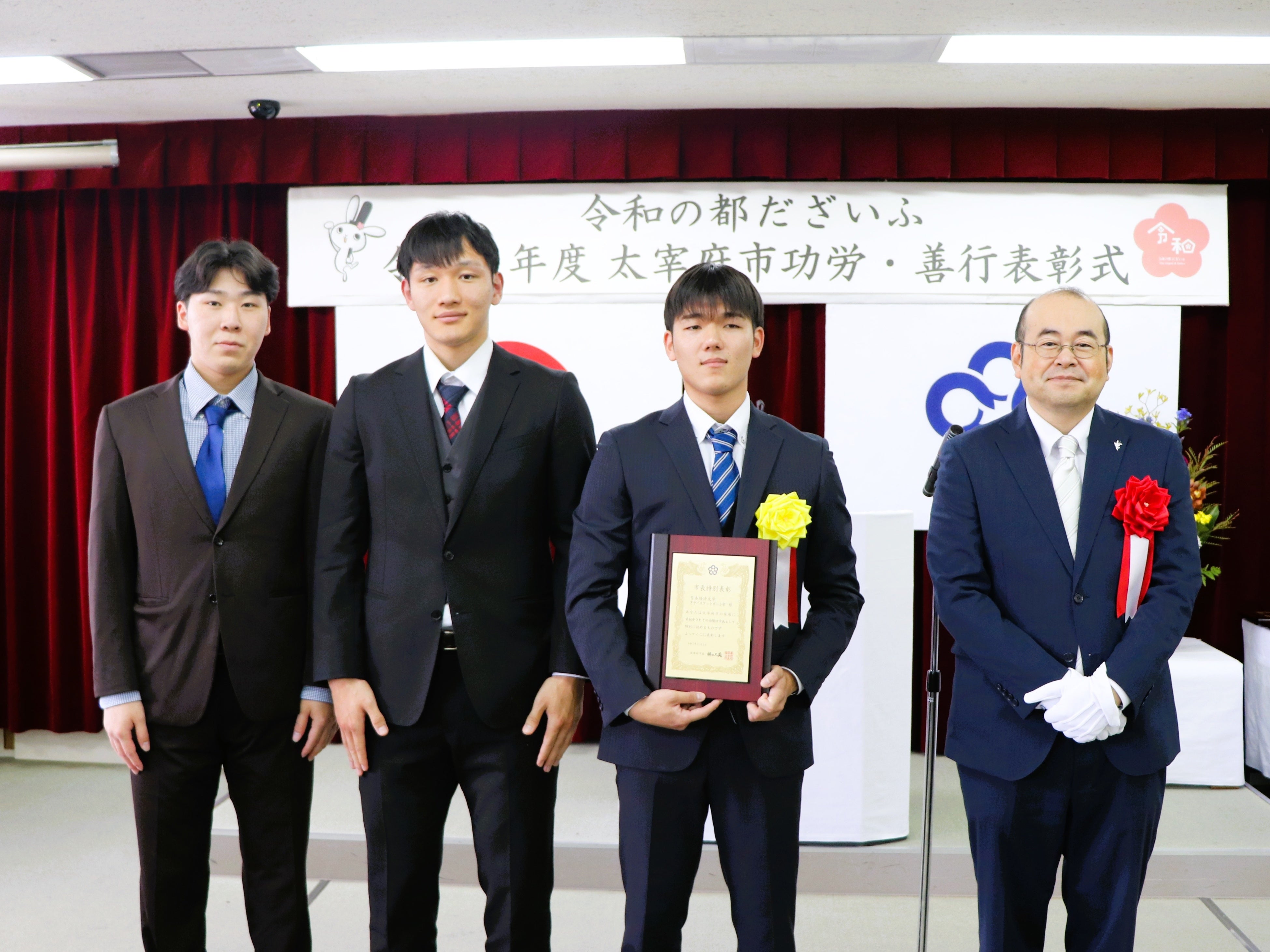 太宰府市長特別表彰は、地域の発展に貢献した個人や団体が対象となります。今年度は9個人、1団体へ贈られました。林さんと男子バスケットボール部を代表して大庭涼太郎さん(健康スポーツ経営学科2年、別府溝部学園高校出身)、是久春道さん(健康スポーツ経営学科2年、安城学園高等学校出身)、淺田竜輝さん(健康スポーツ経営学科2年、八女学院高等学校出身)の3人が出席しました。表彰式では、楠田大蔵市長から盾が手渡されました。