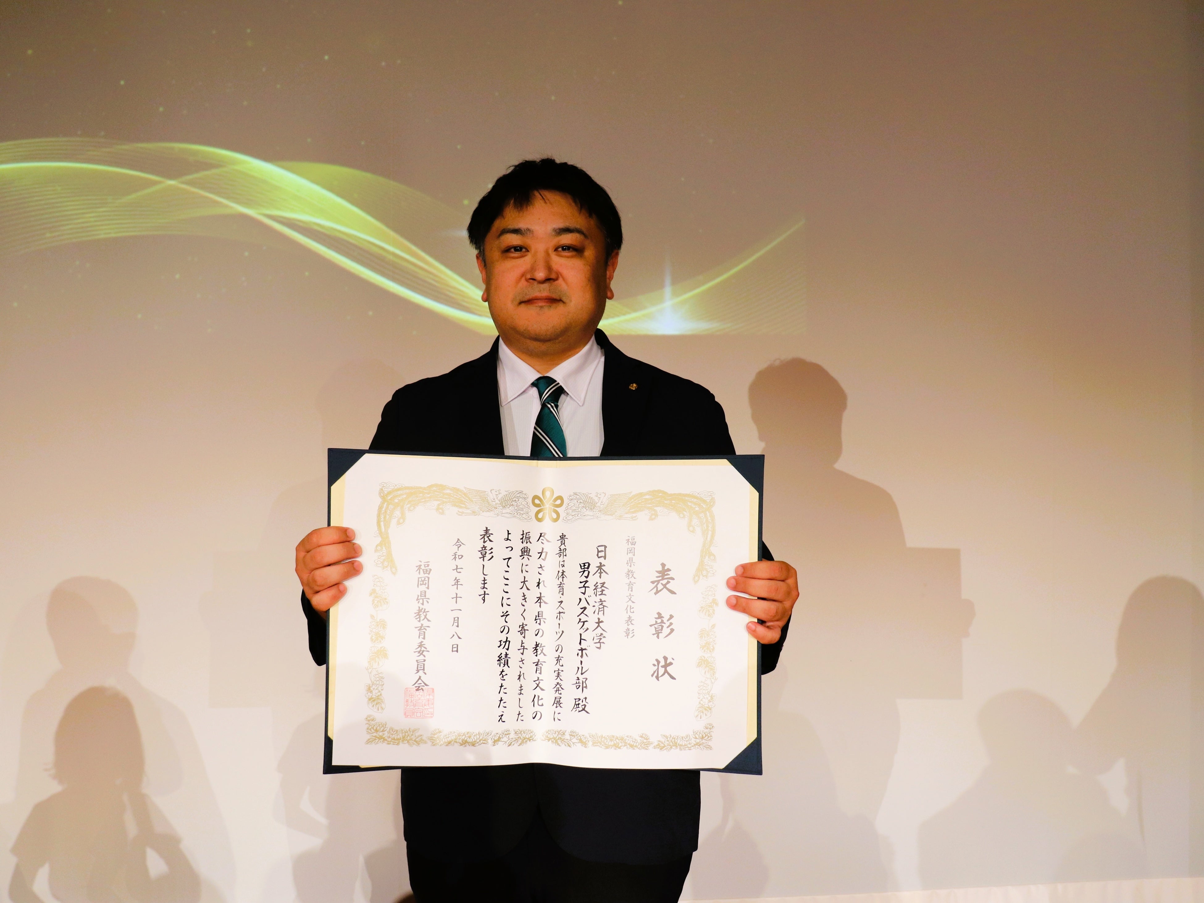 日本経済大学男子バスケットボール部が、令和7年度福岡県教育文化表彰一般の部において、第3回全日本大学バスケットボール新人戦男子で優勝し、福岡県のスポーツ振興に寄与したとして表彰されました。