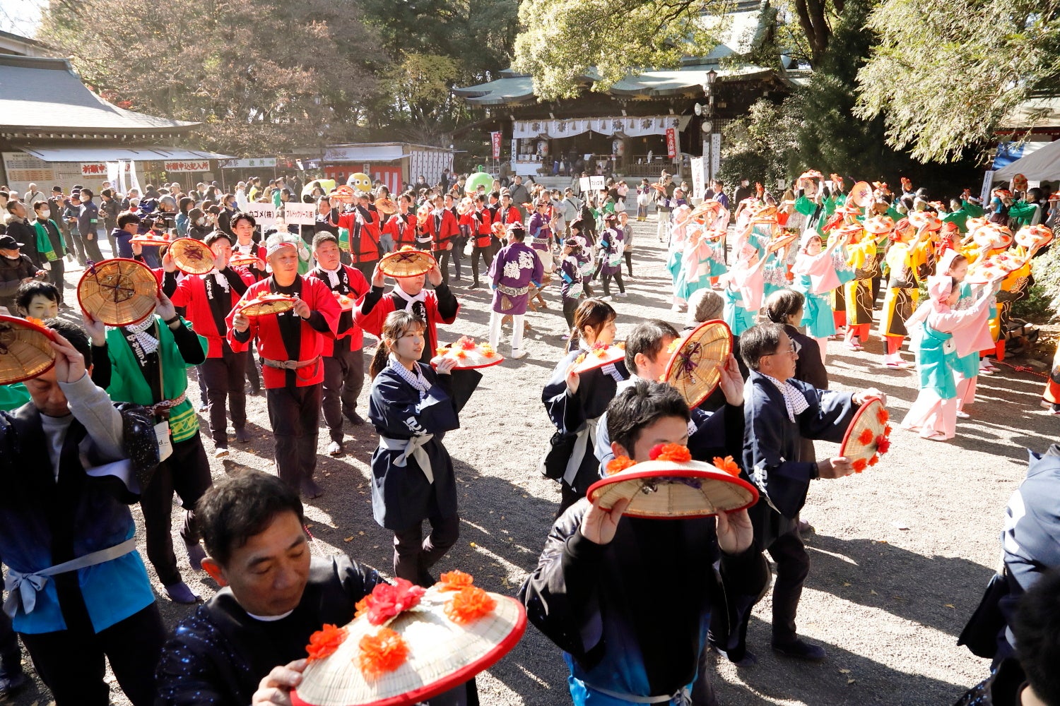 本祭りは、1990年(平成2年)に弊社本部が所在する地元への感謝と地域文化への貢献を目的に、大宮八幡宮の参道をお借りして、地元の官公庁・団体・商店会・民間企業の皆さまと共に始めたものです。以来、飲食・物品販売ブースや総勢200名を超える花笠踊りパレード、チャリティー配布などを通じ、地域に根ざした初冬の風物詩として定着しております。
