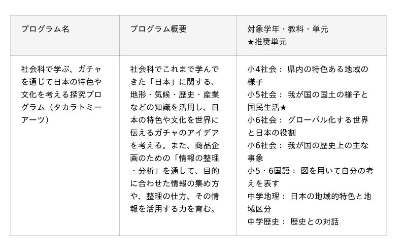 今回はその第七弾として、カプセルトイ(以下「ガチャ」)の商品とマシンを展開している株式会社タカラトミーアーツと連携した「社会科で学ぶガチャを通じて日本の特色や文化を考える探究プログラム」を提供いたします。