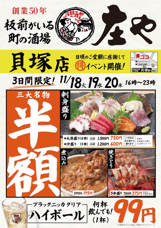 「はい!よろこんで」でお馴染みの“板前がいる町の酒場”『庄や』貝塚店は、2025年11月18日(火)より11月20日(水)までの3日間、16時~23時の限定で、日頃のご愛顧に感謝を込め「刺身盛り合わせ」「煮込み」「焼き鳥」の三大名物を半額とする“半額感謝祭”を実施します。豊洲仲卸直送の鮮魚を使った刺身盛り合わせ「大漁盛り(8種盛)」は、通常1人前1,500円を半額の750円、同「沖盛り(5種盛)」は通常1人前1,200円を600円にて。加えて、不動の人気「煮込み」は通常390円を半額の195円。さらに、創業から受け継がれる味わい「焼きとり五本盛り」は、通常750円のところ半額の375円での超特価で提供します。
