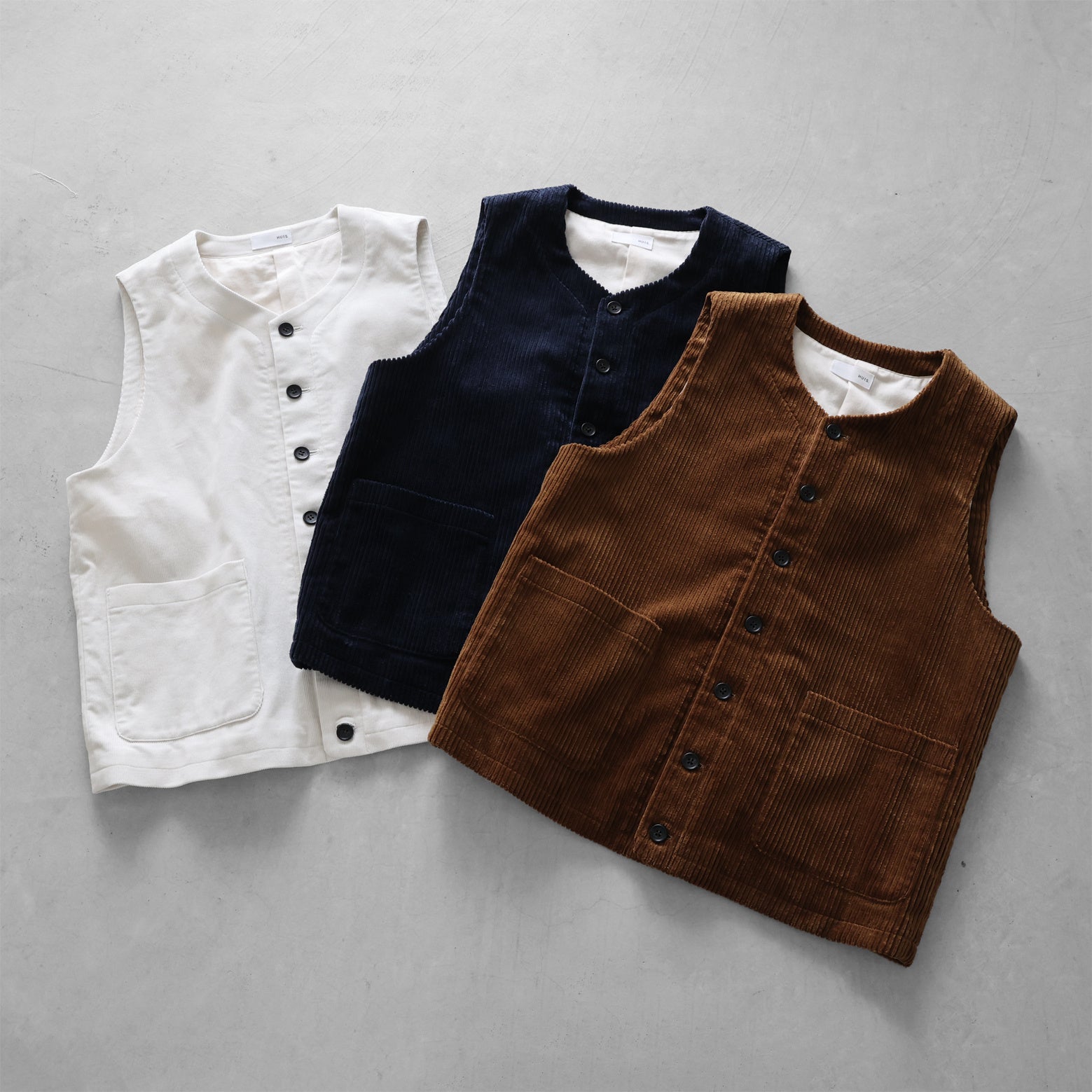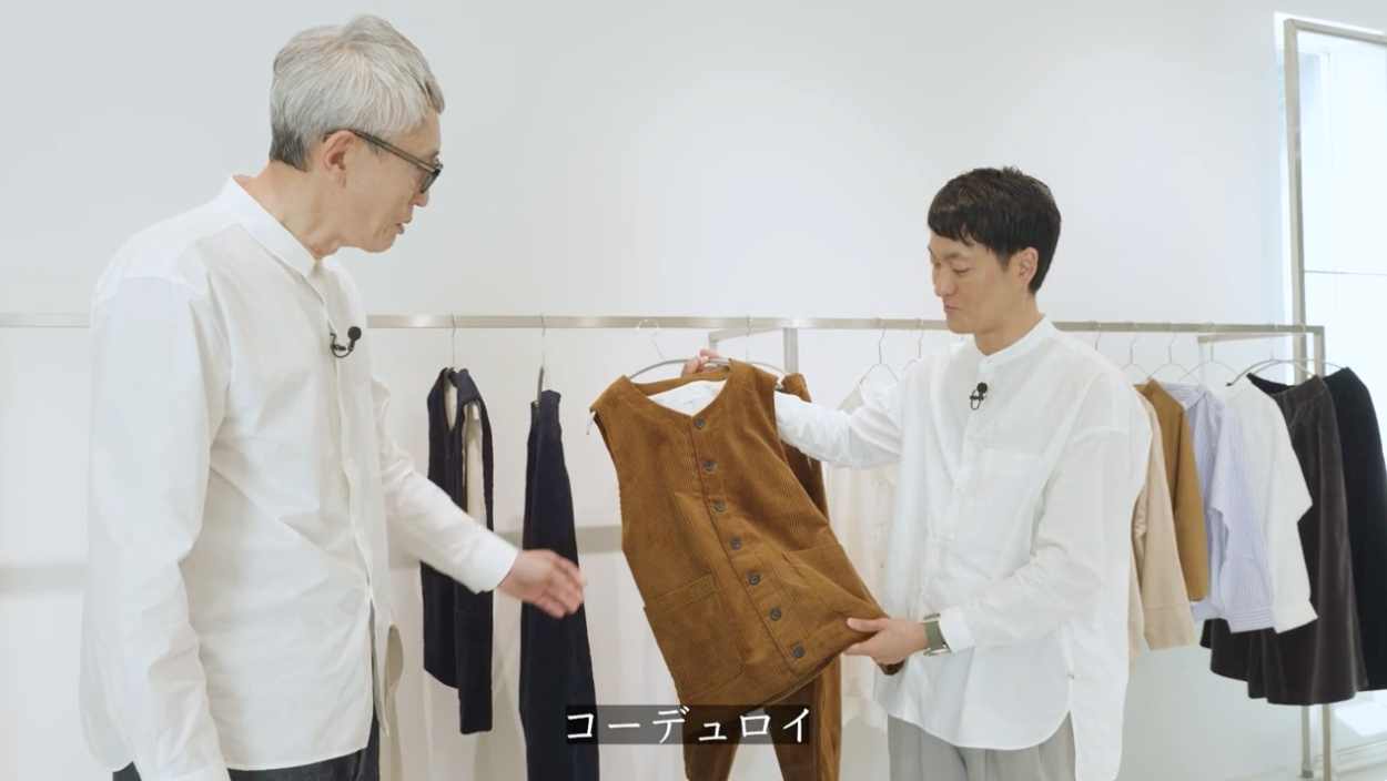ベストは今回のTIMELINEクラウドファンディングのために企画開発したもの。パンツはHUISの定番4型。国産コーデュロイを使用し、それぞれクラウドファンディング限定の3色で限定生産します。