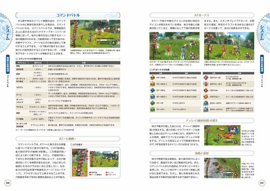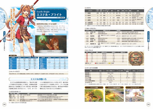 ●各種システムの解説と各キャラクターの戦い方を伝授!メニューの内容や各アクションの操作方法など、本作をプレイするうえで覚えておきたい基礎知識を説明しています。また、料理の作成やオーブメントの仕組み、クイックバトルやコマンドバトルの特徴なども詳しく解説。ほかにもプレイヤーが操作できる8人のキャラクターのレベルアップ時のステータスの上昇傾向、アクションやクラフトの威力、基本的な戦い方もまとめてあります。