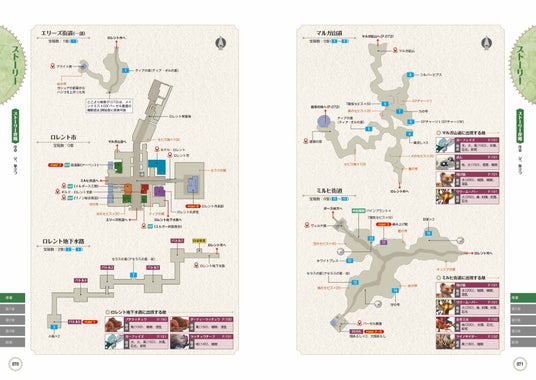 ▲フローチャートはゲーム中に表示される目的を基準にしているため、どこまで進んでいるのか、次に何をすればよいのかが一目瞭然。宝箱や光るポイントの位置がわかるマップ、やり込み要素である料理や書物の入手タイミングも収録しているので、コンプリートを目指すうえで役立ちます。