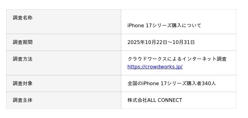 通信インフラ事業と地域振興事業を手掛ける株式会社ALL CONNECT(代表取締役社長:岩井宏太・本社:福井県福井市)が運営する通信メディア「オールコネクトマガジン(https://all-connect.co.jp/magazine/)」は、全国のiPhone 17シリーズ購入者を対象にした「iPhone 17シリーズ購入に関するアンケート」を実施しました。