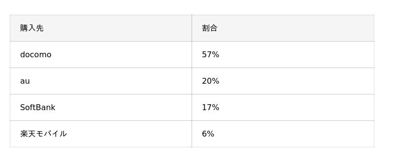 キャリアで購入した人(全体の51%)を対象に購入先の通信キャリア内訳を分析すると、「docomo」経由が最も多く、キャリア経由購入者の過半数を占めました。