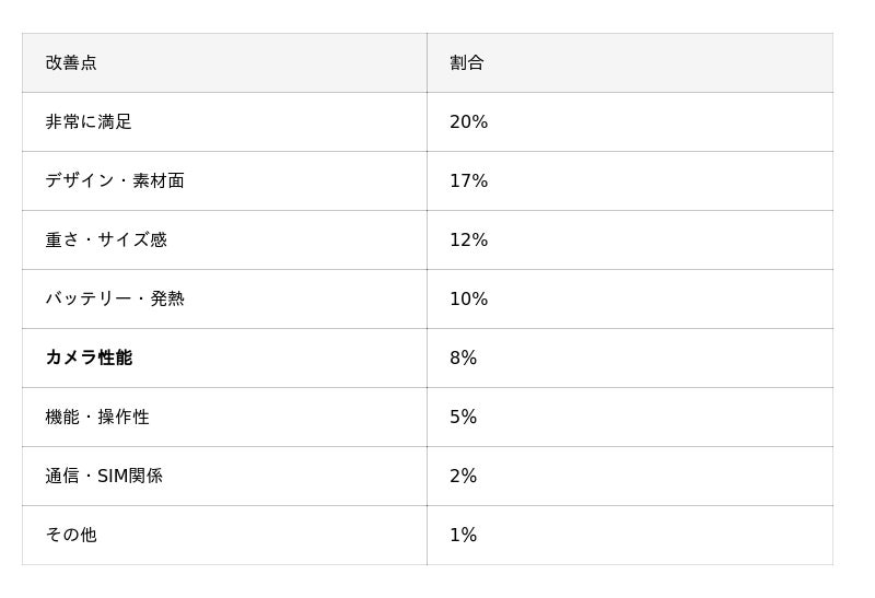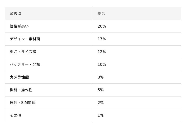 全体としては、スペックや性能の向上よりも、日常使用における快適さや扱いやすさを求める声が目立っており、ユーザーのニーズが機能面から体験面へとシフトしている傾向が読み取れます。