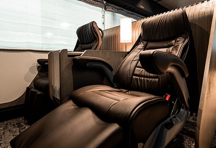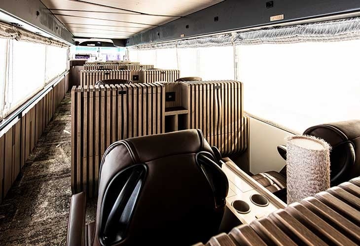 - 大型バス車内なのに僅か12席という限定仕様。ゆったりくつろげる贅沢な空間。- 内装には上品な色合いが特徴の「大川家具」や、高級本革を使用したドイツ直輸入の座席シートを採用。
