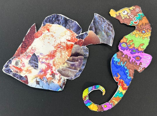 生きもののフォルムが描かれたフォーマットの用紙に参加される方が色を塗ったり、紙を貼ったりして制作し、生徒が表現方法のサポートをします。