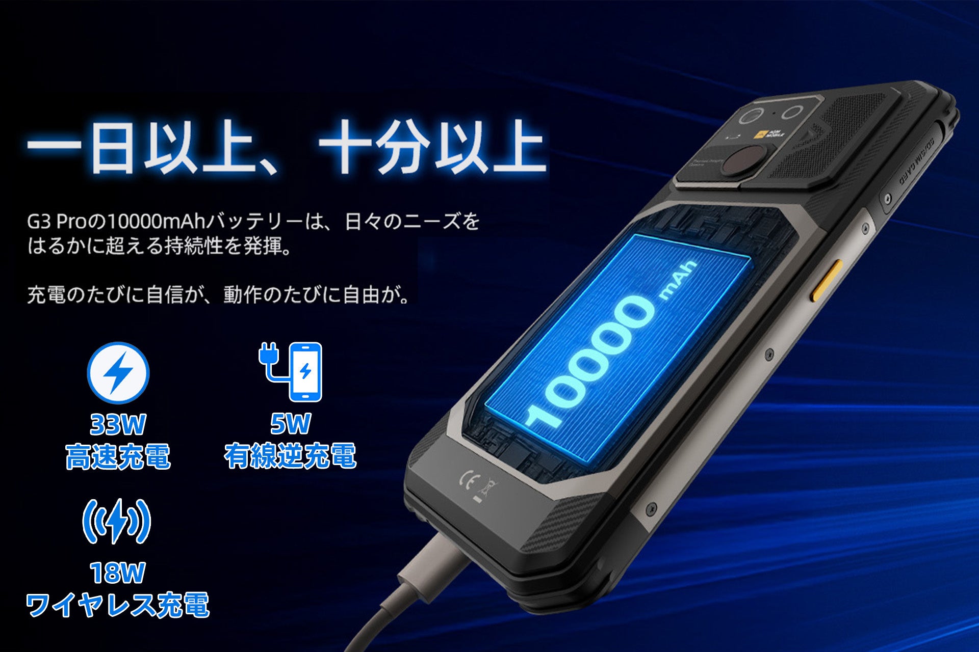 - 大容量バッテリーと高速充電: 10,000mAhバッテリーに加え、33W高速充電と5W有線逆充電を対応。