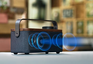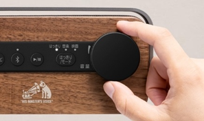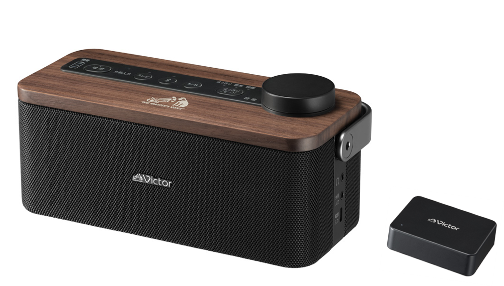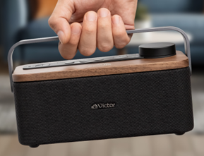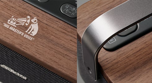 スピーカー部の天板にはインテリアと相性の良い天然木(ウォルナット)を、ハンドル部には落ち着きのあるアルミダイキャストを採用し、上質で機能的かつ、インテリアになじみやすいデザインに仕上げました。また、Victorブランドを象徴する「犬のマーク」をワンポイントでプリントしています。