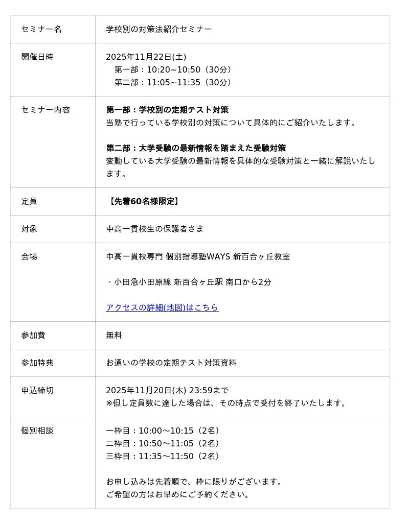 中高一貫校専門 個別指導塾WAYS(運営:株式会社メイツ、本社:東京都新宿区)は、2025年11月22日(土)、中高一貫校専門 個別指導塾WAYS 新百合ヶ丘教室にて、中高一貫校に通う生徒と保護者さまを対象とした無料の「学校別の対策法紹介セミナー」を開催いたします。