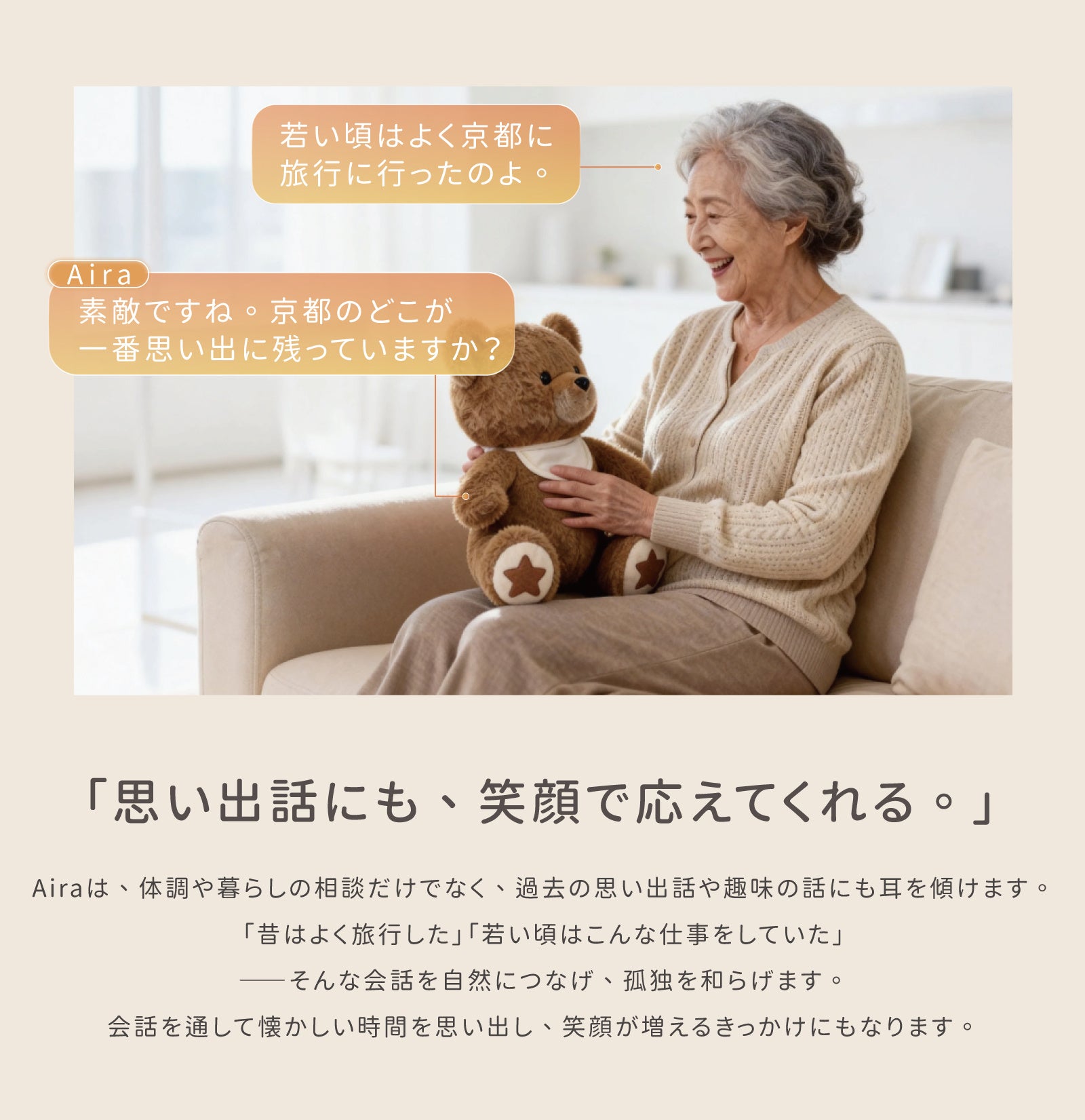 話しかけた言葉を覚え、返してくれるAIくま。一人暮らしの寂しさをそっと埋め、日常に“対話のぬくもり”を届ける、新しいコミュニケーションパートナー。