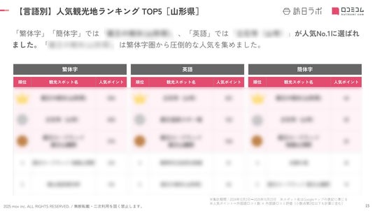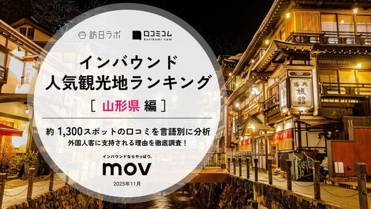 業界最大級のインバウンドビジネスメディア「訪日ラボ」及び 店舗向け集客一元化プラットフォーム「口コミコム」を運営する株式会社mov(代表取締役:渡邊 誠、本社:東京都渋谷区、以下mov)は、山形の観光地に寄せられた最新の口コミデータから、独自の『インバウンド人気観光地ランキング』を発表しました。
