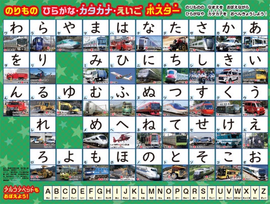 のりものの写真と名前を通して、ひらがなを覚えられるポスターです。カタカナ・アルファベット表もついています。