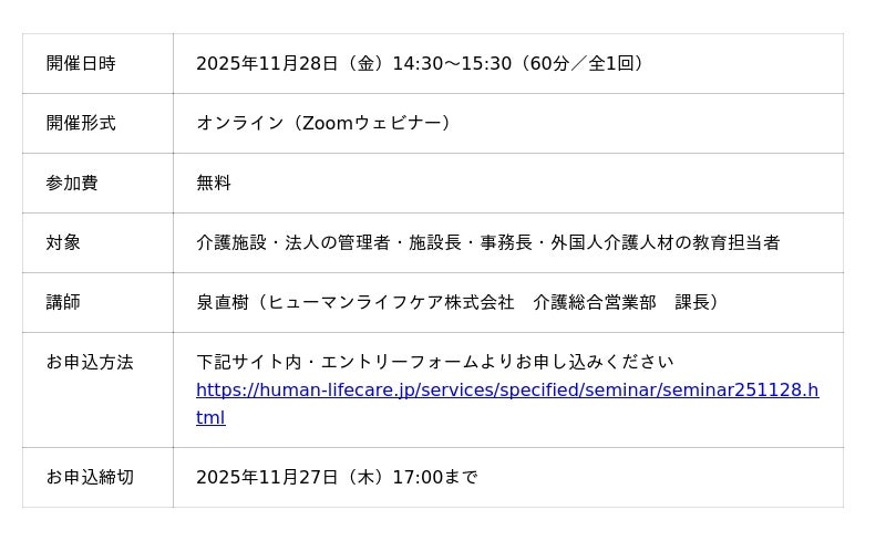 介護事業等を展開するヒューマンライフケア株式会社(本社:東京都新宿区、代表取締役:瀬戸口信也、以下「当社」)は、外国人介護人材に関する無料オンラインセミナー「介護福祉士「パート合格制度」で合格率は上がる?施設管理者がおさえるべきポイントとは?」を、11月28日(金)に開催いたします。