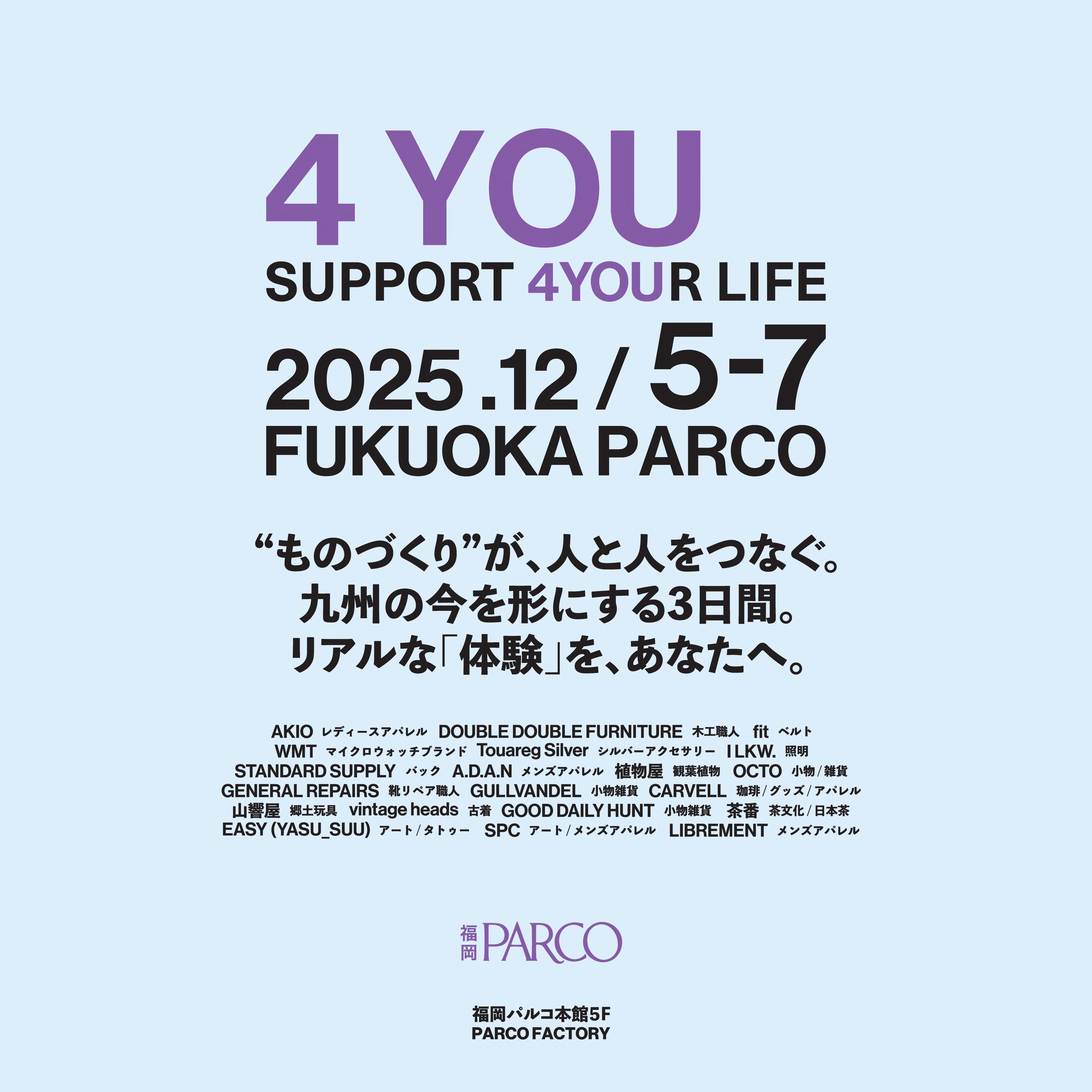 福岡PARCO(福岡県福岡市中央区天神)では、12月5日(金)から12月7日(日)の3日間、“ものづくり”を通じて世代を超えた人と人、地域を繋ぐマーケットイベント「4 YOU(フォーユー)」を開催いたします。