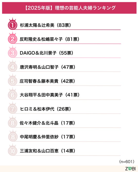 国内最多の成婚数を誇る株式会社IBJのグループ会社である株式会社ZWEI(本社:東京都中央区、代表取締役:橋爪みずほ、以下「ZWEI(ツヴァイ)」)は、全国男女601名に対して「理想の芸能人夫婦」をテーマにした独自アンケート調査を実施。結果、1位にはSNSやYouTubeでも家族の日常を積極的に発信する「杉浦太陽・辻希美」夫妻が選ばれました。