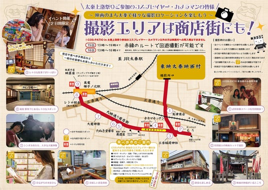 今年4月に完成した映画村の新・オープンセットに加え、上洛まつりならではのフォトポイントが充実。「上洛まつりでしか撮影できない写真」にこだわり、村内を演出いたします。なお、コスプレ参加をされる方は「COS-PATIO in 太秦上洛まつり」のチケットが必要となります。 (数量限定・売り切れ次第終了) 詳しくは「COS-PATIO in 太秦上洛まつり」の公式サイトをご確認ください。