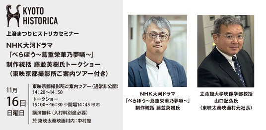 藤並さんからは、テレビ番組の制作現場に長年携わってきた視点から、太秦(京都)およびNHKで培われた時代劇制作の技・匠を総動員して、『べらぼう』で描いた江戸時代の背景、社会、各登場人物の思惑などについてお話しいただきます。
