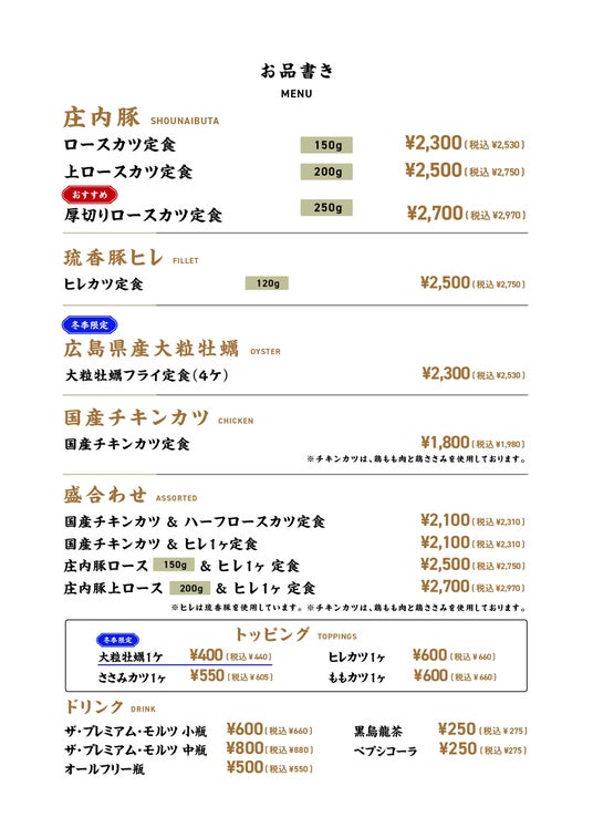 - 山形県産 「庄内豚」柔らかく味わいのある赤身と、あっさりとした甘みのある脂が絶妙なバランスの銘柄豚です。ロースカツで使用しています。