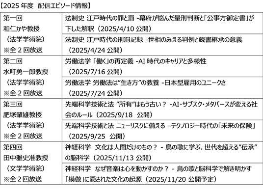 これまでのシリーズ『法学学術院:法のフロンティア:AI社会の「安全網」を設計する ~賠償と保険の未来~/肥塚肇雄教授』『法学学術院:労働法の羅針盤でひらく 激動の時代の働き方/水町勇一郎教授』『法学学術院:江戸時代の罪と罰、江戸時代の刑罰記録/和仁かや教授』『政治経済学:理論で紐解く政治と経済の結びつき/浅古泰史准教授』『政治学方法論:因果革命で切り拓かれた、人文社会科学での数理的素養の可能性/山本鉄平教授』『ゲーム理論:「ゲーム理論」の現在地とこれから/船木由喜彦教授』『国際関係論:国際政治を科学する。理論とデータで導く国際平和への処方箋/多湖淳教授』『教育心理学:子どもの心を科学する! 実践主義を徹底したアンガーマネジメント研究/本田恵子教授』『応用言語学:文理融合で社会実装 言語教育のAI活用を支える言語テスト妥当性研究の真髄/澤木泰代教授』『社会学:世の中の前提を紐解く、社会学的感覚/若林幹夫教授』『紫式部の生きた軌跡・宮廷女房たちが映し出す平安社会の姿/福家俊幸教授』も番組HPより視聴いただけます。