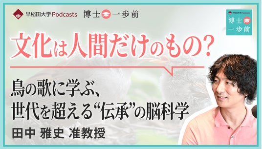 早稲田大学(東京都新宿区、総長:田中愛治)は、Podcast番組「博士一歩前」の新エピソードとして、文学学術院の田中 雅史(たなか まさし)准教授をゲストに『文化は人間だけのもの?ー鳥の歌に学ぶ、世代を超える"伝承"の脳科学ー』の配信を開始しました。