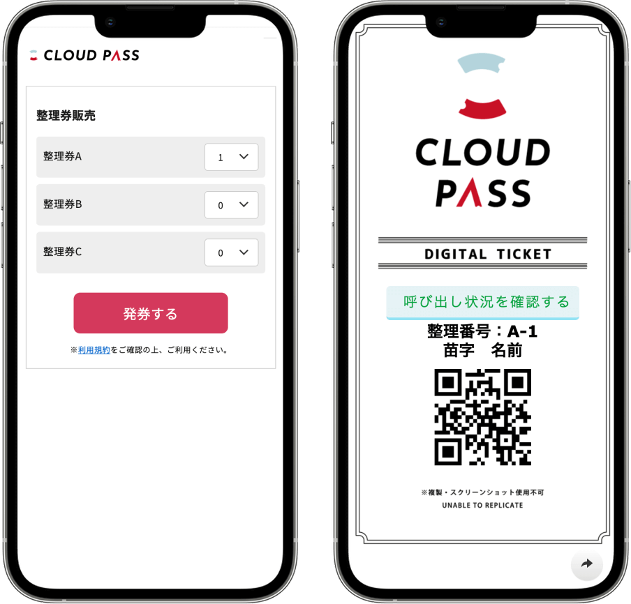 券面に公式サイトやSNSへ遷移できるボタンを設置することで、来場者が自分の呼び出し番号を確認できる仕組みにより、運営負担の軽減と安全な来場管理を両立します。