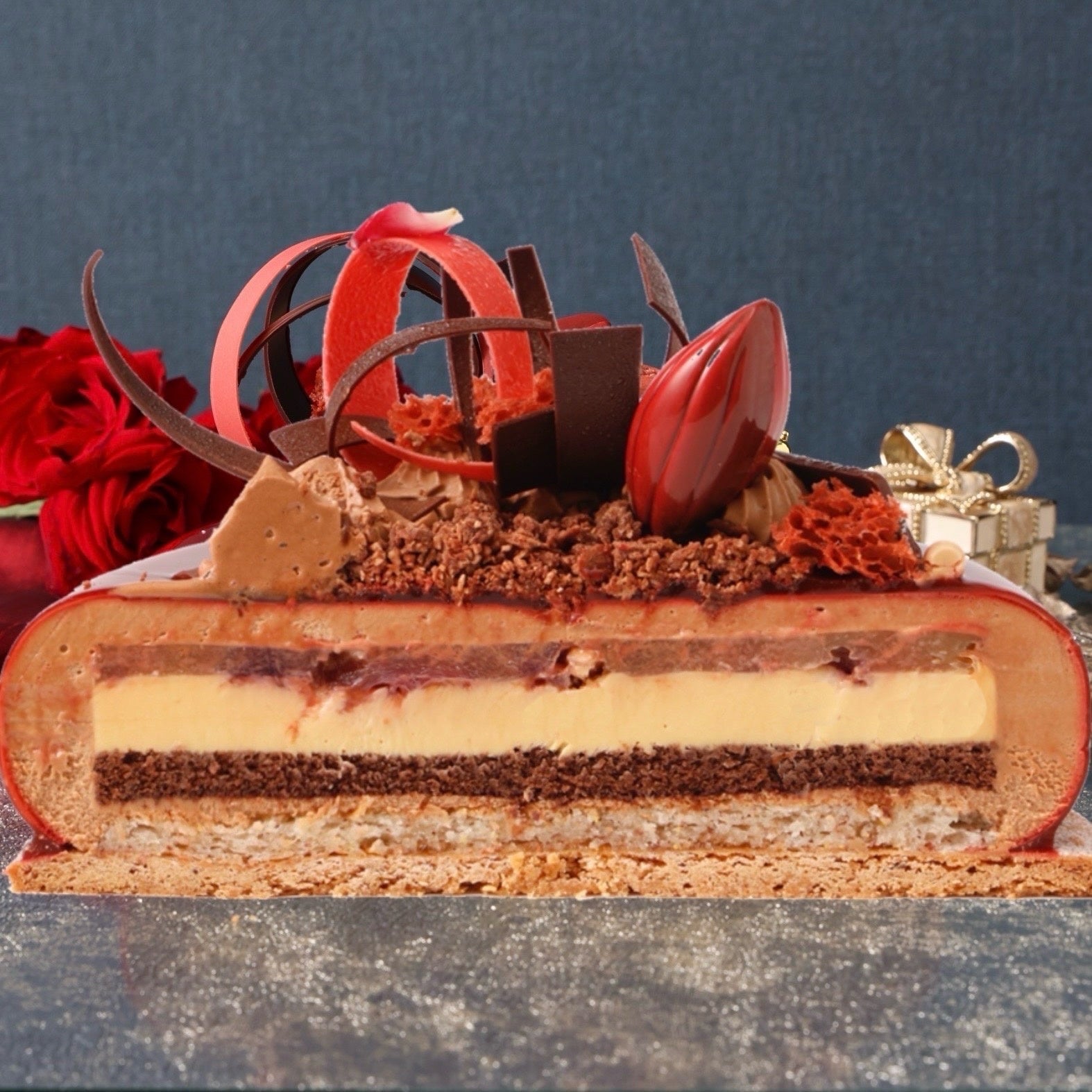 サクサクとしたクリスピーな生地にチョコレートとラズベリーのムースを合わせ、柔らかなチョコレートスポンジと濃厚なプラリネピスタチオクリーム、ミルキーなホワイトチョコクリームを重ねました。