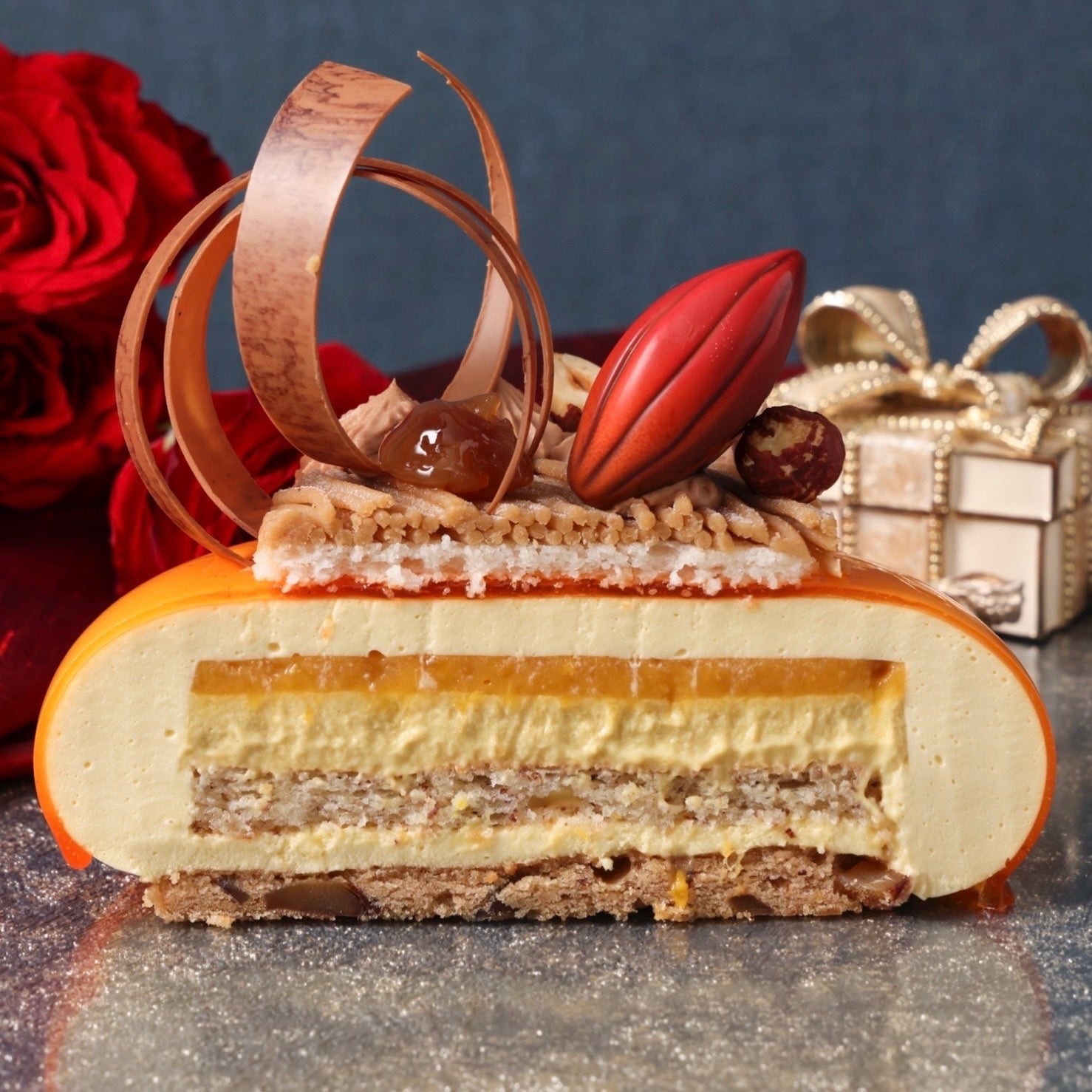 華やかな酸味のあるアプリコット×桃のコンフィととろけるマロンクレームブリュレをメープルムースで包み込み、優しい甘さのミルクチョコレートで軽やかに仕上げています。