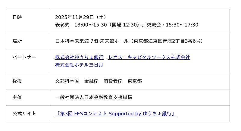 一般社団法人日本金融教育支援機構(東京都千代田区 共同代表理事:平井梨沙、阿部奈々 以下「当機構」)は、2025年11月29日(土)にお台場の日本科学未来館7階未来館ホールで表彰式を開催する「 第3回 FESコンテスト Supported by ゆうちょ銀行」のファイナリストと、「お金の8つの力」をそれぞれテーマとした8点の佳作を発表しました。