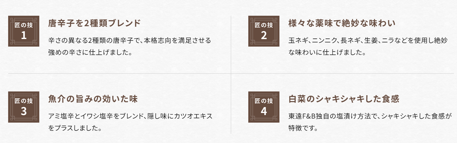 「匠の技」とは、モランボンが培ってきたキムチの味づくりのノウハウ。韓国産原料のおいしさを引き出し、深いコクと辛さを実現しました。