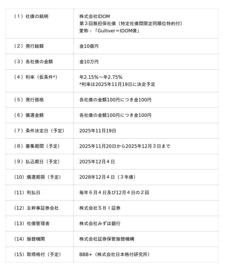 中古車の「ガリバー」を運営する株式会社IDOM(本社:東京都千代田区丸の内二丁目7番2号 JPタワー26階、以下:当社)は、2025年11月13日付「初の個人投資家向け社債『Gulliver=IDOM債』発行に関するお知らせ」にて公表しました個人投資家向け社債(以下、「本社債」)について、11月19日、下記のとおり発行条件を決定いたしました。