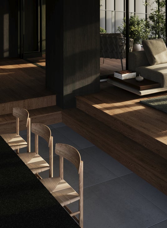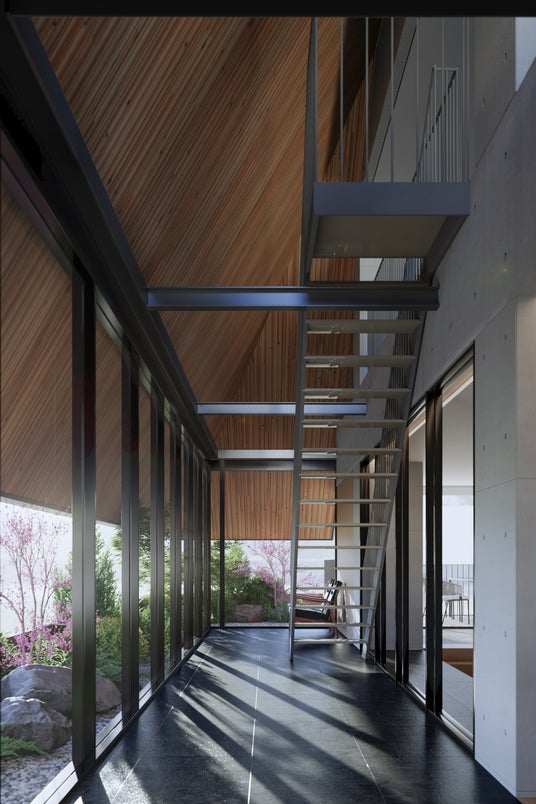 「距離感」のデザイン:50mという敷地の特徴を生かし、「長さ・奥性・高さ」を「間と余白を繋ぐ、コンテンポラリー・レイヤリング」のデザインでまとめました。特にペントハウスのメゾネット空間や、アウトドアリビングや日本庭園と繋がる空間は、視覚的な広がりと「間(ま)」の豊かさを提供し、都市生活に求められる内省的な豊かさを実現します。