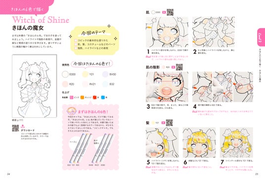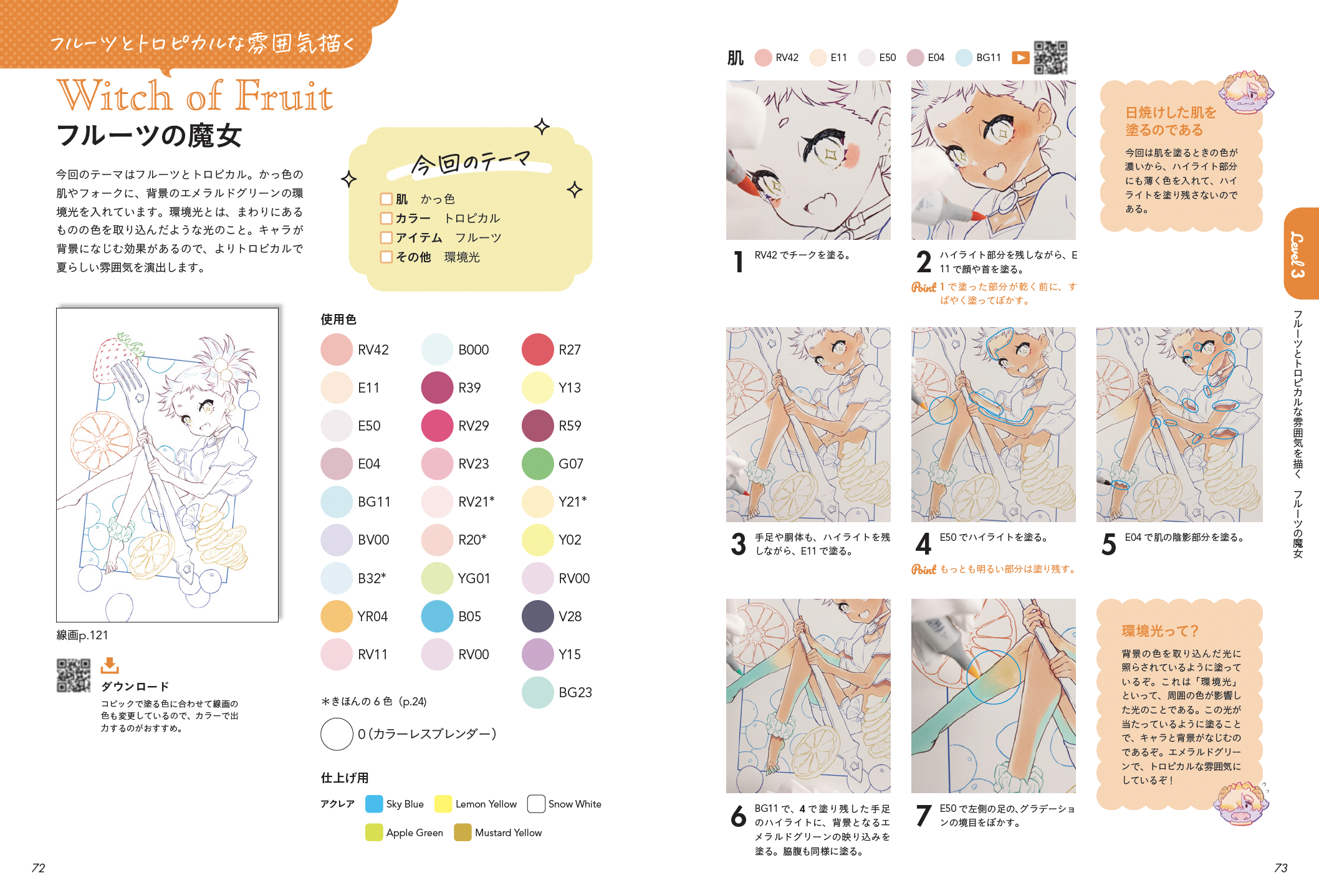少しずつ使う色数を増やして、8人のキュートな魔女たちを塗りながら、難しい表現もたのしく学べます。
