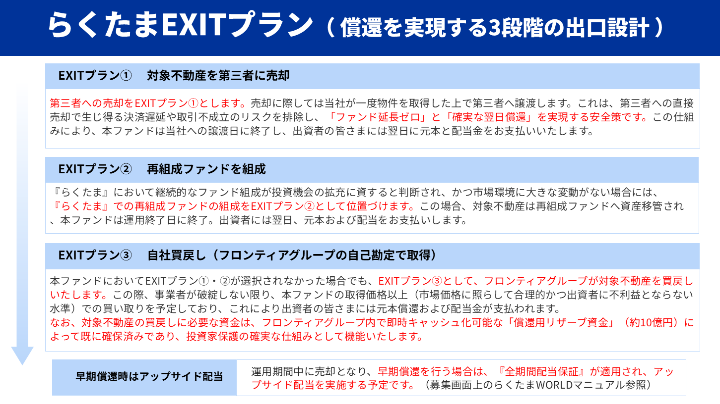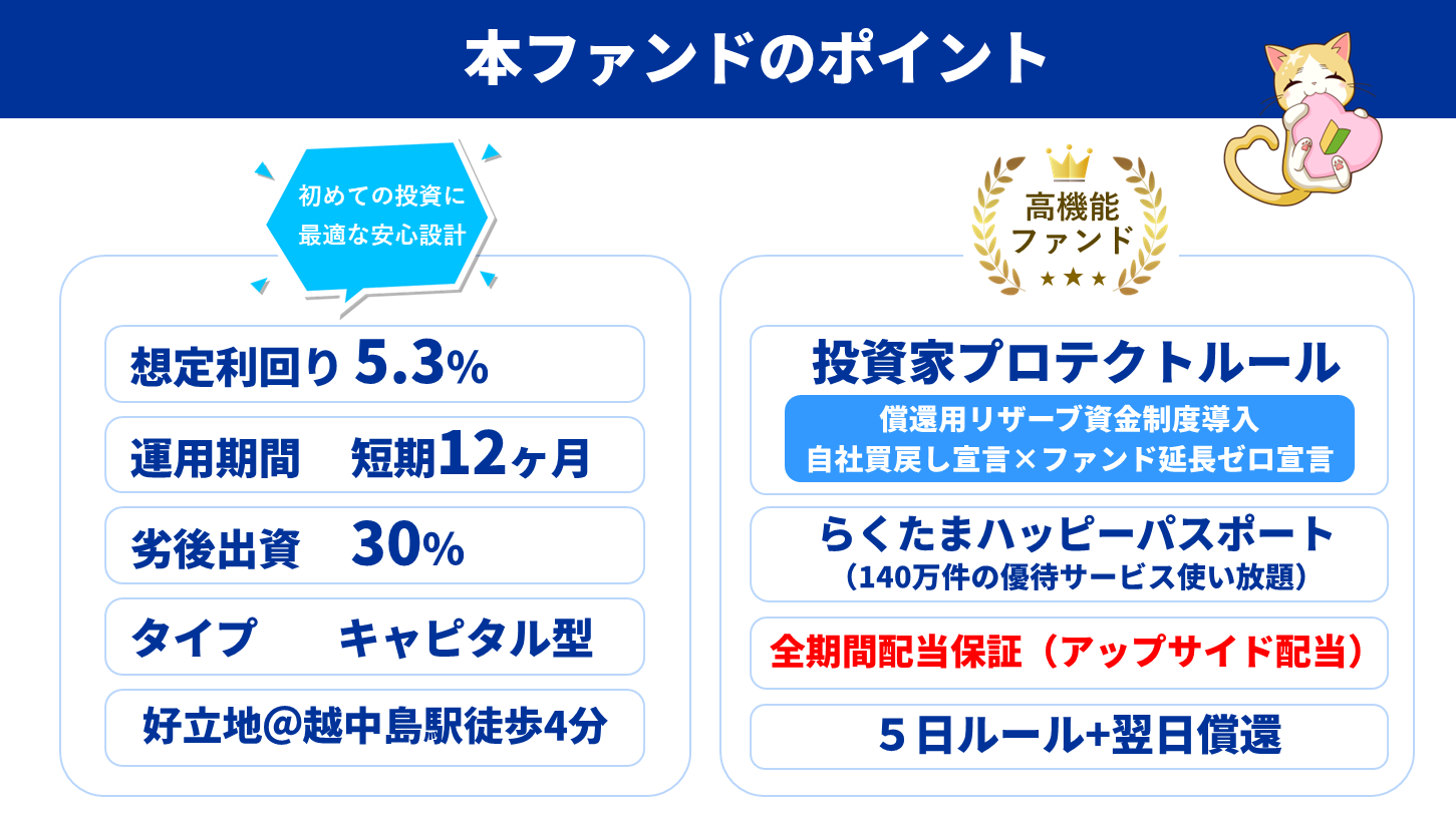 『らくたま』は、不動産クラウドファンディングをより安心で身近な資産形成の手段としてお届けするために誕生しました。私たちは安全性と透明性を常に重視し、堅実なファンド設計と多彩な特典プログラムを通じて、従来の「投資=堅い・難しい」という固定観念を取り払い、誰もが1万円から参加できる新しい投資体験を提供してまいります。信頼に支えられた資産運用を楽しみながら、以下の特典もぜひご体験ください。
