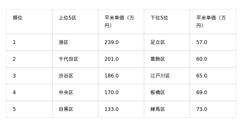 東京都内平米単価の上位区・下位区別ランキング(2025年10月時点)