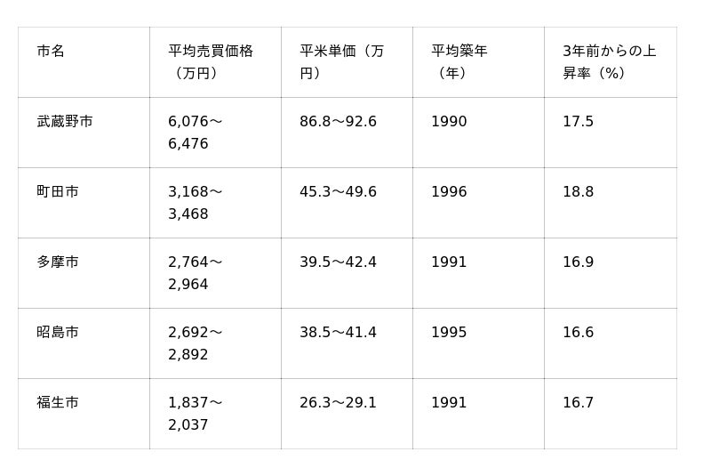 23区外エリアで平均売買価格の上昇率が高かったのは、町田市・多摩市・昭島市・武蔵野市の5市でした。