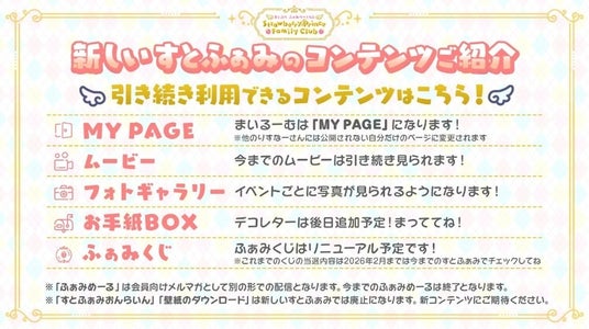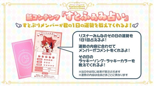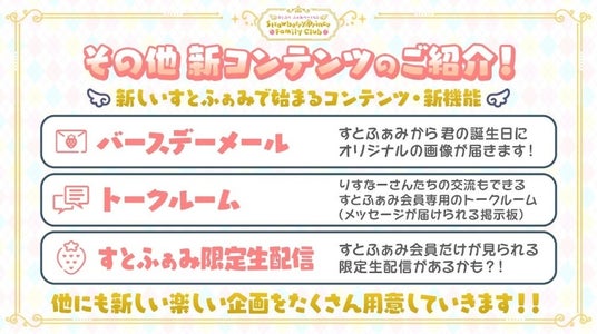 新しい「すとふぁみ」では、毎日アクセスして楽しめる「すとふぁみ占い」、ライブやイベントにあわせて交流できる「トークルーム」、誕生日に限定メッセージが届く「バースデーメール」、会員だけが視聴できる「すとふぁみ限定生配信」などの新コンテンツを導入しました。